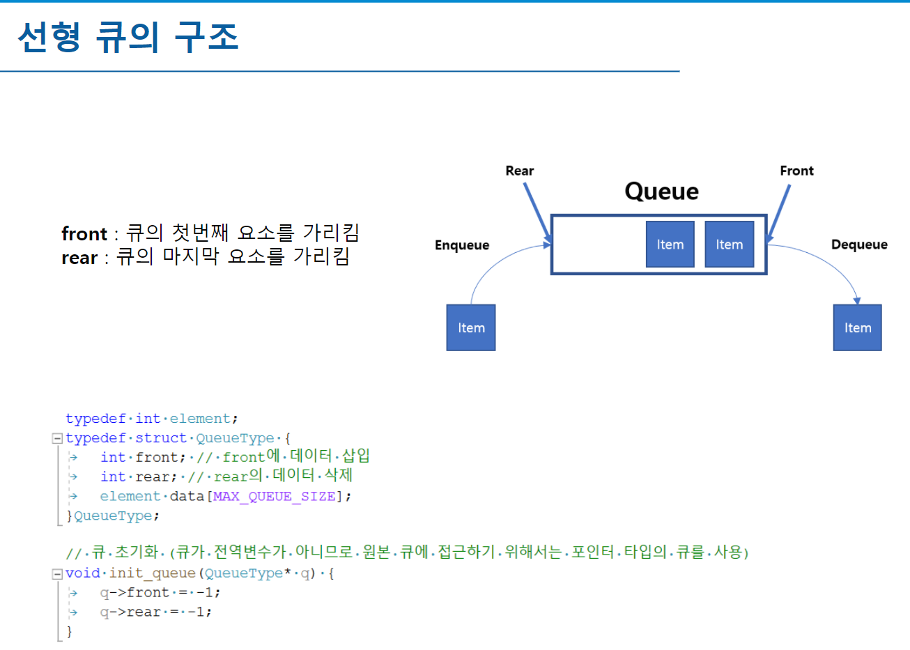위에서 설명한 기본적인 큐의 구조와 입출력 형태, ADT 모두 선형 큐를 설명한 것이다.