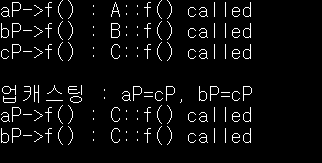 이번에는 업캐스팅을 통해 기본 클래스의 포인터로 파생 클래스의 객체를 가리키는 경우 함수를 호출하는 경우이다.