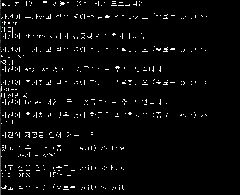 map 컨테이너를 사용한 간단한 영-한 사전 프로그램 예제