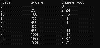cout<<setw(15)<<left<<"Square";