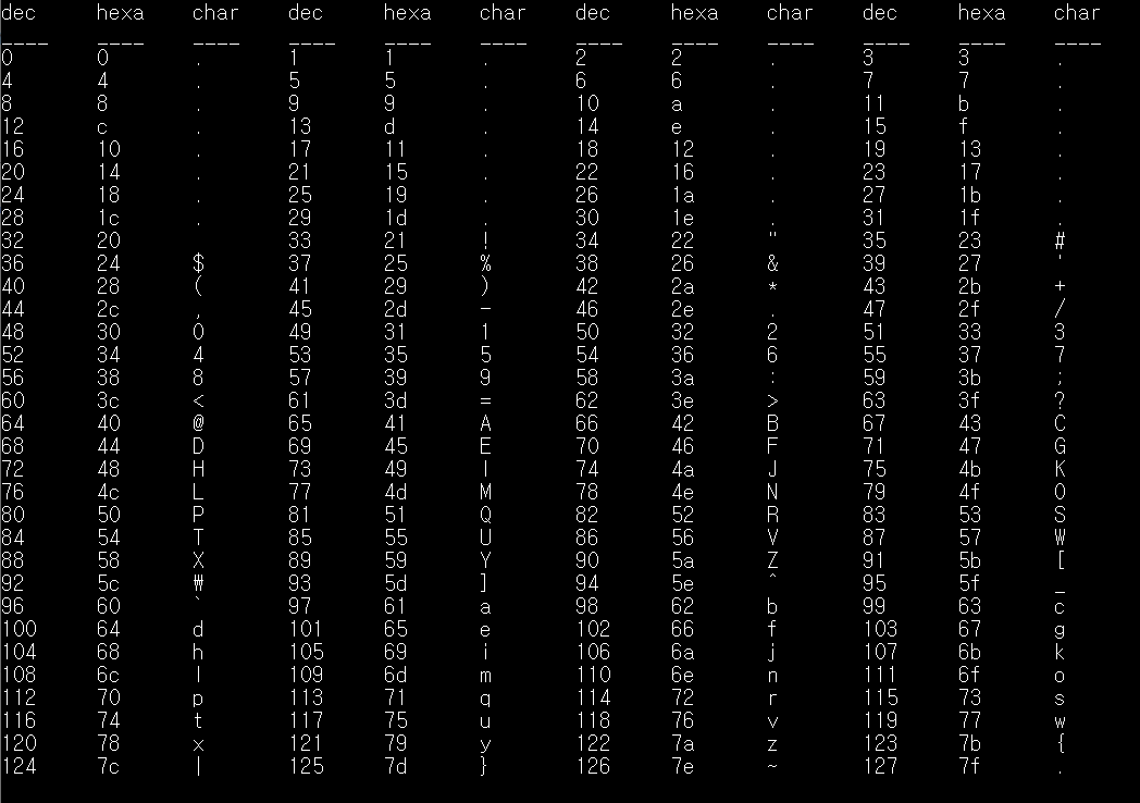 cout << "dec" << '\t' << "hexa" << '\t' << "char "<< '\t';