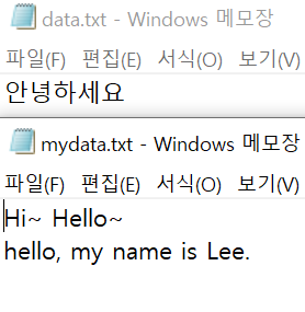 mydata.txt 파일을 텍스트파일/출력/파일의 끝에 파일 포인터 이동 모드로 열어 읽은 문자를 파일 끝에 출력하도록 한다.