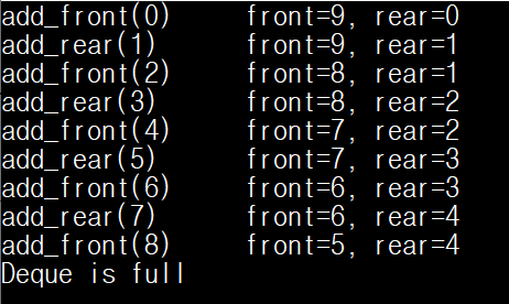 덱의 MAX_QUEUE_SIZE가 10으로 정의되었으므로, 총 9개(0부터 8)의 요소만 삽입이 된 것을 확인할 수 있다.