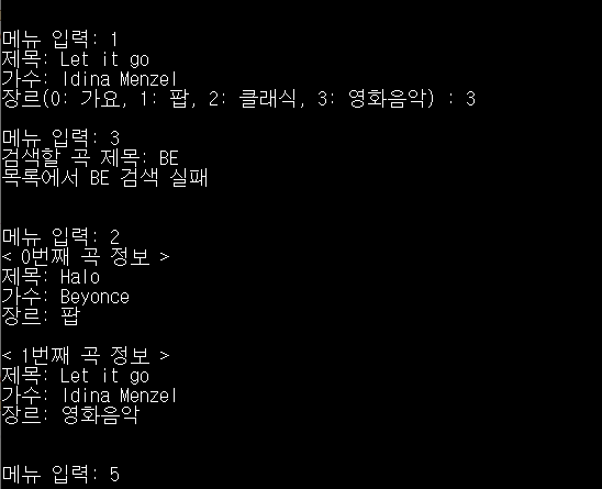- music 구조체와 구조체 배열: 곡 명(문자열), 가수(문자열), 장르(정수형)