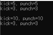 따라서 (5,5) -> (8,8) -> (11, 11) -> (10, 10) 으로 a의 멤버인 kick과 punch 변수가 차레대로 변경된다.