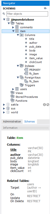 네비게이터 바를 통해 스키마를 자세히 살펴보면, 다음과 같다.