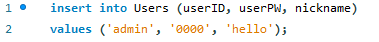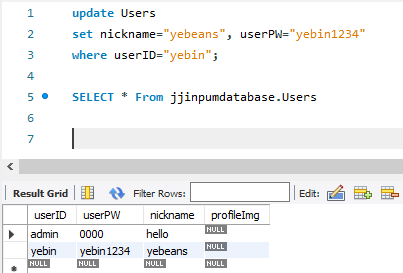 위는 User 테이블에서 userID가 "yebin"인 레코드의 nickname 필드와 userPW 필드를 수정하는 예시이다.