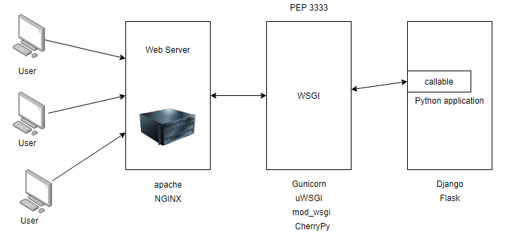 WSGI는 웹 서버와 Python 언어를 사용하는 웹 서버 어플리케이션 개발 환경(Django 또는 Flask와 같은 프레임워크 포함) 간의 연결을 중계하는 로우-레벨 인터페이스이다.
