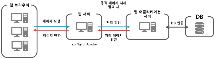 클라이언트인 웹 브라우저의 정적 페이지 요청은 웹서버가 처리하고,