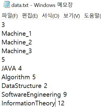 /* 파일에 저장된값 : 3개의 기계 , 5개의 작업 이름과 시간