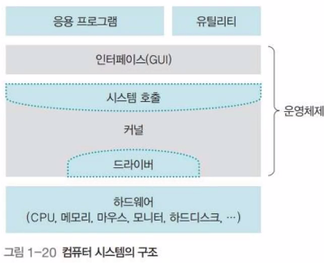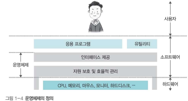- 운영체제: 사용자에게 편리한 인터페이스 환경을 제공하고 컴퓨터 시스템의 자원을 효율적으로 관리하는 소프트웨어