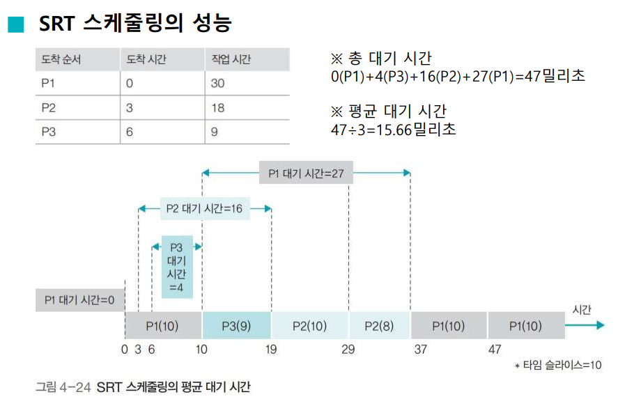- 현재 실행중인 프로세스와 큐에 있는 프로세스의 남은 시간을 주기적으로 계산하고, 남은 시간이 더 적은 프로세스와 문맥 교환을 해야 하므로 SJF스케줄링에는 없는 작업이 추가됨