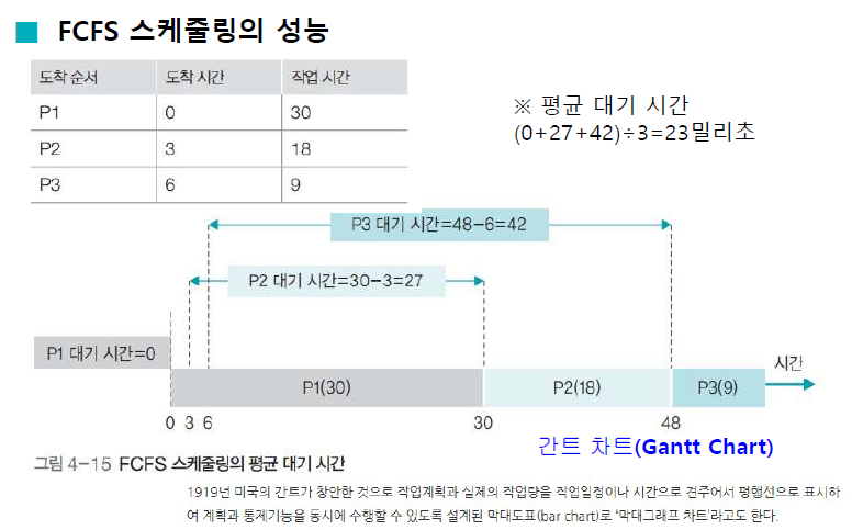 - CPU 사용 시간이 긴 프로세스 때문에 CPU 사용 시간이 짧은 여러 프로세스가 오랫동안 기다리게 되어 시스템의 처리율이 떨어짐