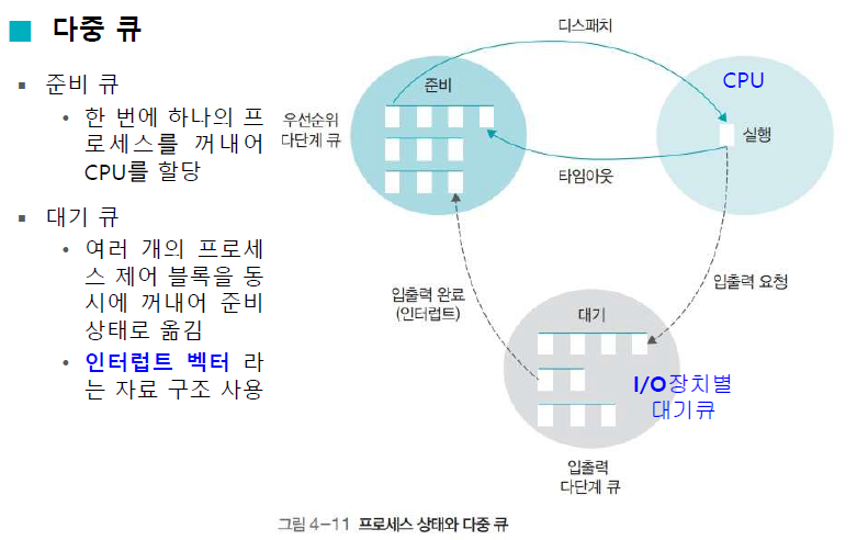 - 프로세스는 OS로부터 부여 받은 우선순위에 따라 해당 우선순위 큐에 삽입