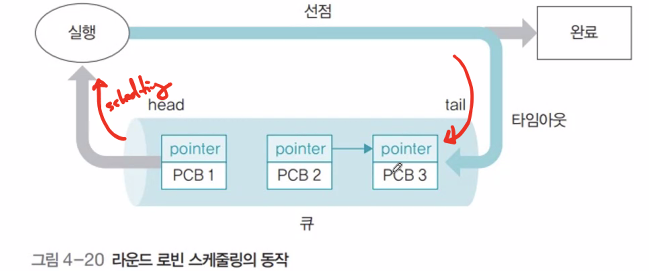 - 한 프로세스가 할당받은 시간(타임 슬라이스) 동안 작업을 하다가 작업을 완료하지 못하면 준비 큐의 맨 뒤로 가서 자기 차례를 기다리는 방식