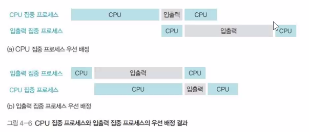 - 스케줄링 할 때 입출력 집중 프로세스의 우선순위를 CPU 집중 프로세스보다 높이면 시스템의 효율이 향상