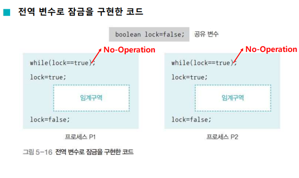 - p1이 임계 구역에 들어가 있는 경우 lock을 false로 설정하여 다른 프로세스가 들어올 수 없도록 처리. 임계구역을 다 사용한 후에는 lock을 true로 변경