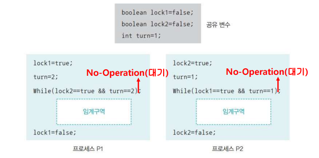 - 프로세스 P1은 잠금을 풀고(lock=1false) 프로세스 P2가 작업을 마칠 때까지 기다림[while(turn==2);]