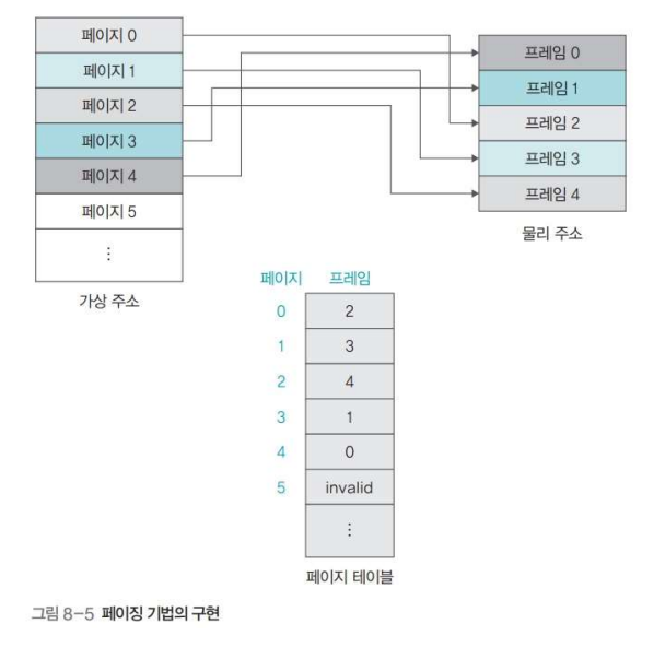 - 가상 주소의 분할된 각 영역인 **페이지(page)**에 번호를 매겨 관리하고, 물리 주소의 각 영역을 분할한 **프레임(frame)**에 번호를 매겨 관리한다.