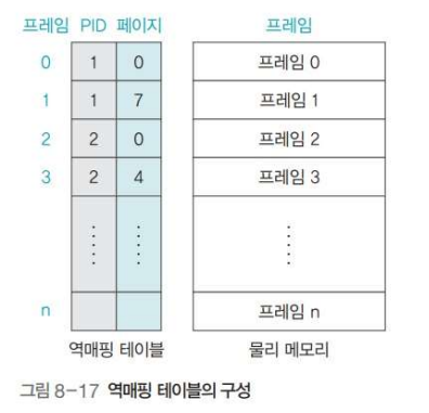 - 주소 변환 시 메모리 관리자는 주소 변환을 해야 하는 프로세스의 아이디와 페이지 번호가 물리 메모리에 있는지 역매핑 테이블에서 검색