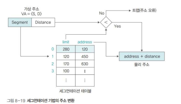 - 가상주소 VA = <S, D> (S: 세그먼트 번호, D: 해당 세그먼트의 물리주소 시작 위치로부터의 거리)