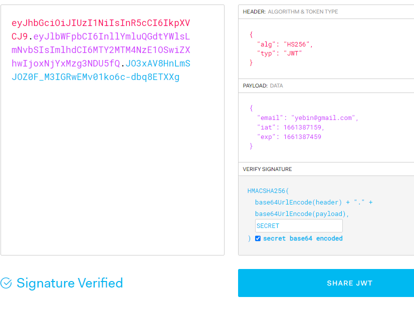 Signature Verified 로 변경되며 정확한 JWT 토큰 값이 생성된 것이라 볼 수 있다.