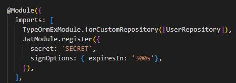 secret 키를 SECRET 으로 지정해주고, signOptions로는 토큰 만료 시간을 300초로 지정해준다.