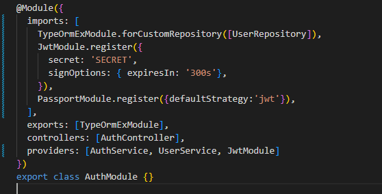 auth.module.ts 파일에 imports 부분에는 PassPortModule을, providers 부분에는 JwtModule을 추가해주자.