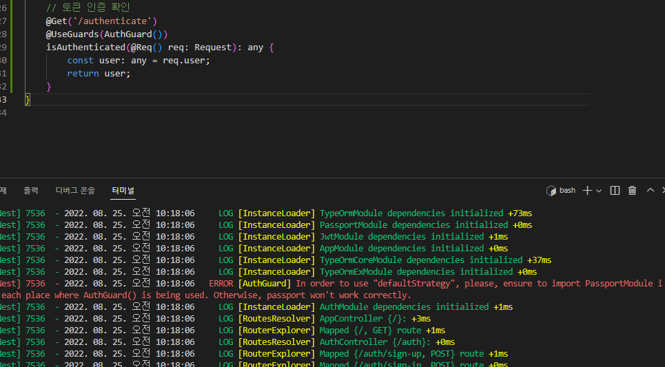 auth.contoroller.ts 에서 위에서 작성했던 토큰 인증 라우터 부분에서