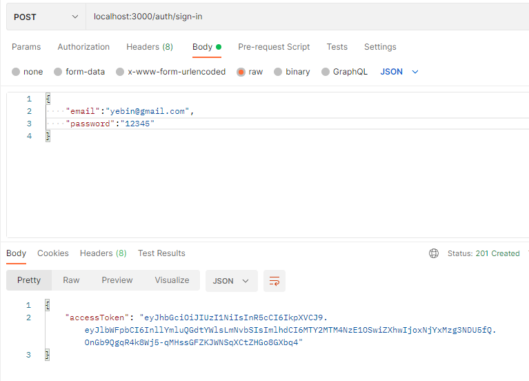다음과 같이 로그인 시도를 했을 때, accessToken이 발급된 것을 확인할 수 있다.