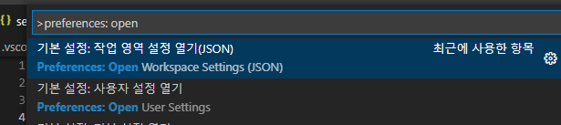 이번에는 [Preferences: Open Workspace Settings (JSON) ] 부분을 열어