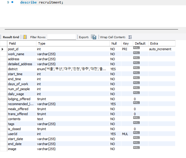 recruitment 테이블과 각 칼럼들이 잘 생성되었음을 확인해보자.