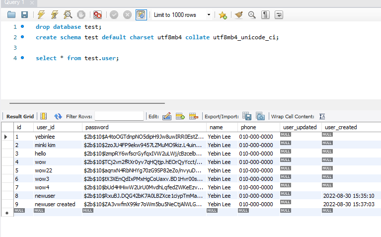 primary key로 사용될 id, 사용자 ID, 비밀번호, 휴대폰번호, 프로필 사진, created/updated 날짜를 포함한다.