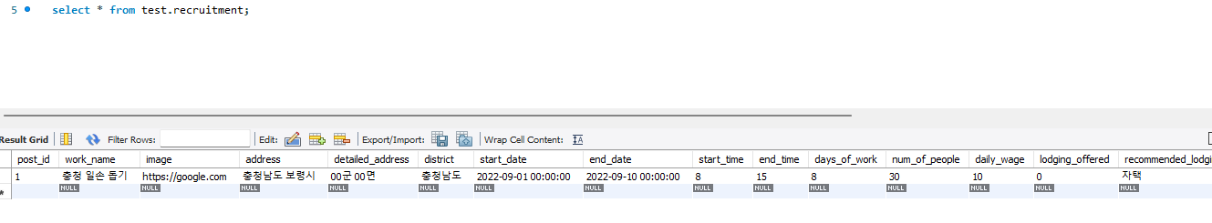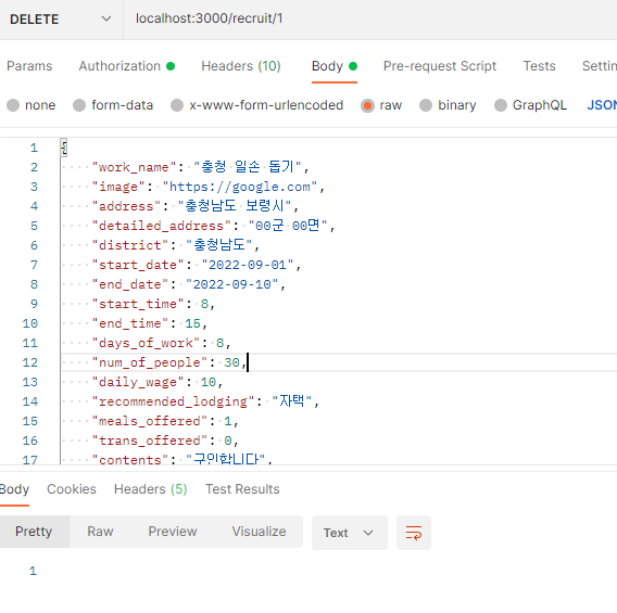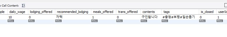 post_id 값이 1인 구인글 객체가 다음과 같이 나타남을 확인할 수 있다.