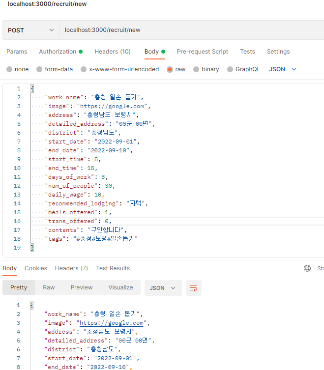 별다른 에러 발생 없이 올바르게 POST 요청이 전송되어, response로 recruitment 객체를 전달한 것을 확인할 수 있다.