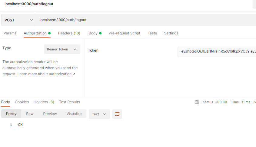 accessToken으로 로그아웃 POST 요청을 하면, OK 메세지와 함께 로그아웃 완료가 된다.