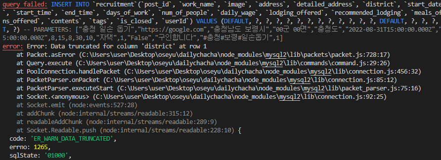 Data truncated for column 'district' at row 1 이라는 error message가 뜬다.
