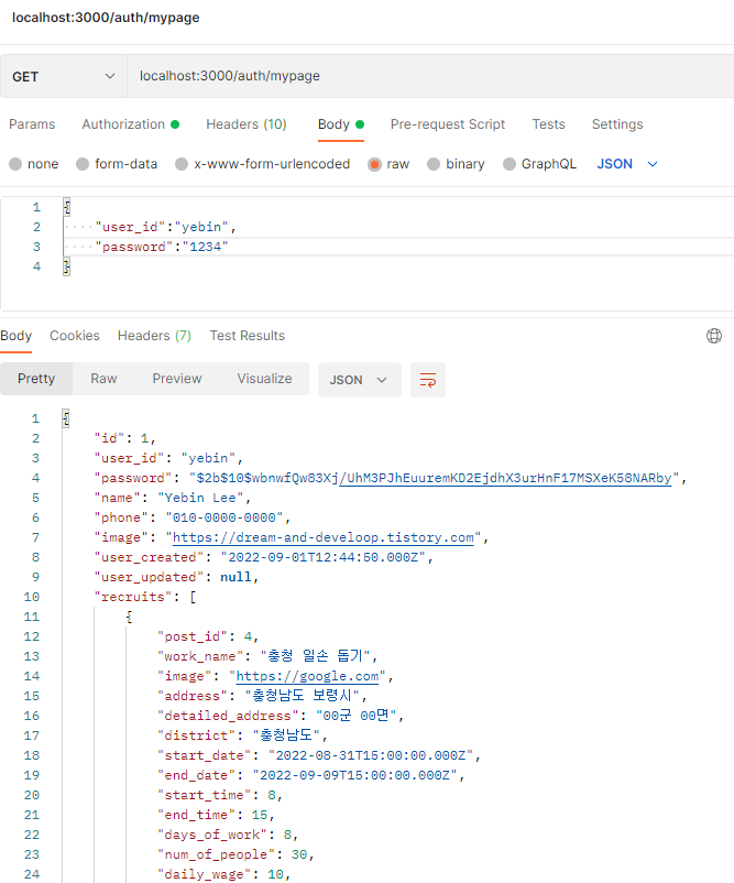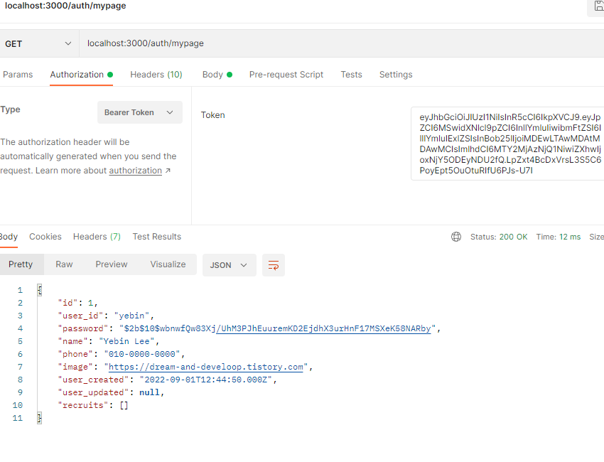 recruits 배열을 칼럼에 포함한, 현재 로그인된 user 객체가 Response로 반환됨을 확인할 수 있다.