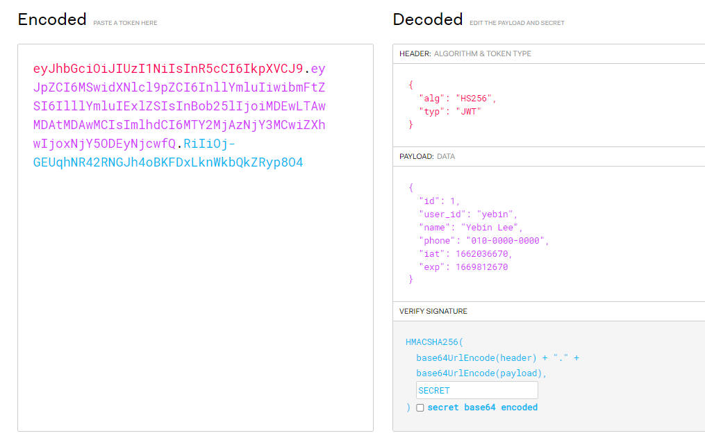 header, payload, signature 부분에 토큰을 디코딩한 결과가 각각 나타나는 것을 확인할 수 있다.