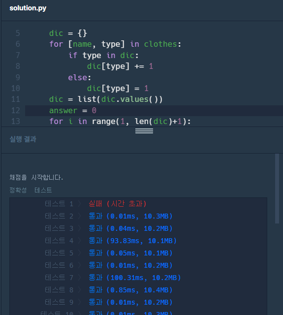 - 처음에는 type (의상 종류) 를 key로, 해당 종류의 의상의 개수 value로 하는 사전에서 values() 값만 뽑아낸 리스트를 이용해, combinations() 을 이용해 의상을 고를 수 있는 모든 조합의 수를 구하는 방법을 택했다.