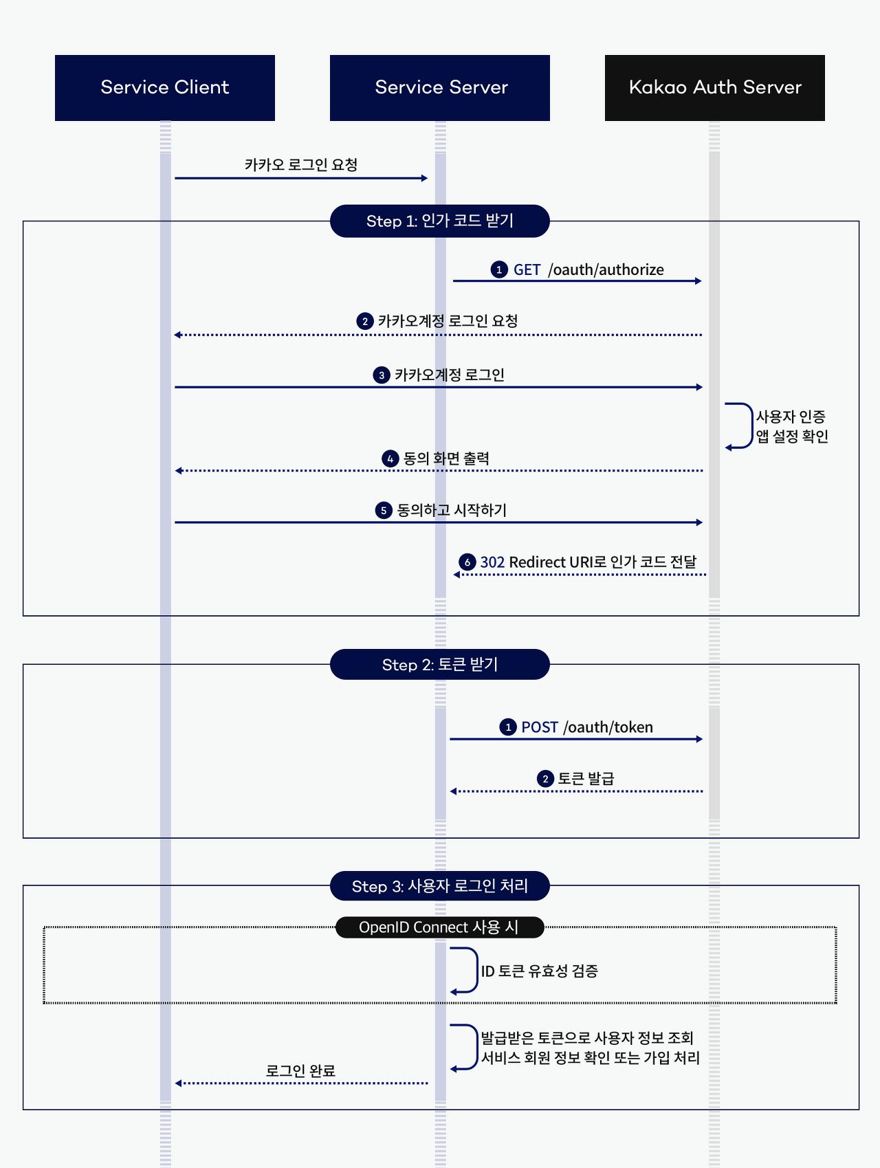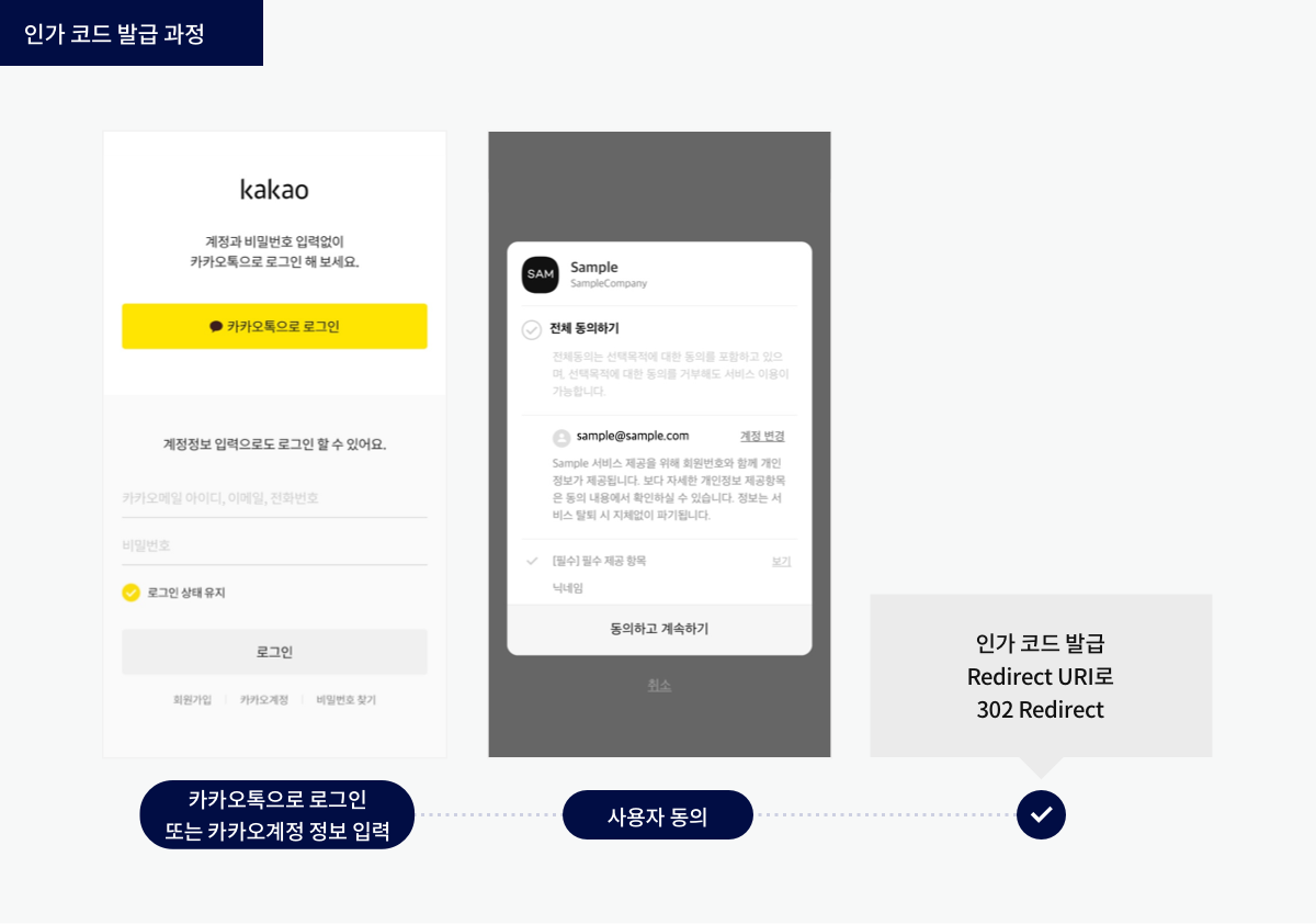 카카오 로그인 과정은 인가 코드 받기, 토큰 받기, 사용자 로그인 처리의 3가지 Step 으로 이루어진다.
