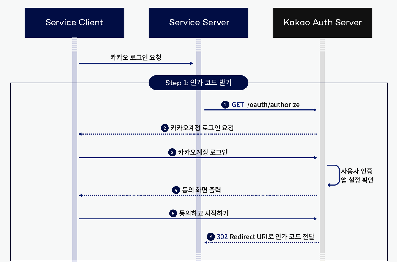 - 서비스 서버가 카카오 인증 서버로 인가 코드 받기를 요청한다.