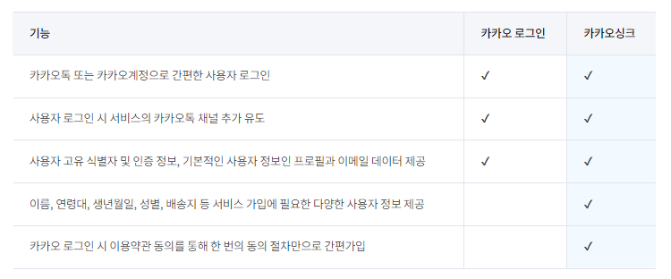 카카오 로그인과 카카오 싱크에서 제공하는 기능들은 다음과 같다.