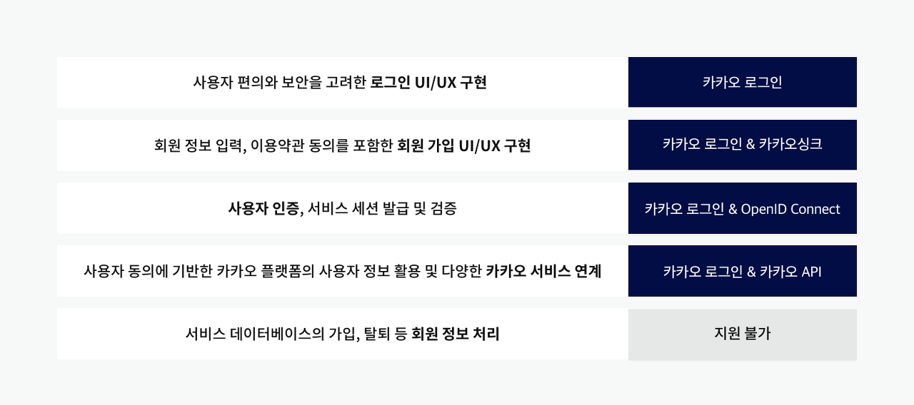 | 인증(Authentication) | ID와 비밀번호로 사용자 신원을 확인 각 서비스에 사용자가 카카오계정으로 로그인할 수 있는 기능 지원 서비스에서 각 사용자를 식별할 수 있는 고유한 회원번호 제공 |