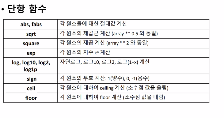 np.mean(): 평균np.sum(): 합np,.cumsum(): 누적 합np.cumpord(): 누적 곱- 속성값으로
