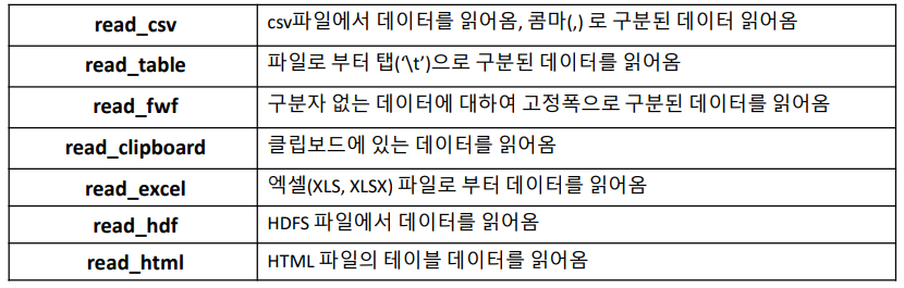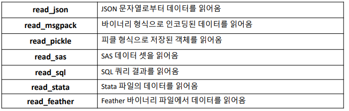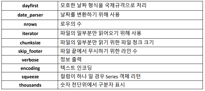 - pandas에서 표 형식의 텍스트 데이터를 DataFrame 객체로 읽어오는 몇 가지 기능