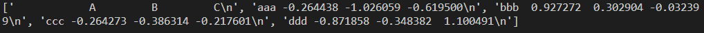 # read_table을 이용해 인덱스 추론, 공백 문자를 기준으로 데이터값들 자르기 def re_seperator(): print(list(open('examples/ex3.txt'))) result = pd.read_table('examples/ex3.txt',sep='\s+') print(result) - 데이터의 로우보다 컬럼이 하나 적기 때문에