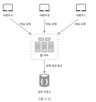 상태 정보에 의존적이지 않은, 무상태 아키텍처의 경우 사용자로부터의 HTTP 요청은 어떠한 웹 서버로도 전달 가능하며, 웹 서버는 상태 정보가 필요한 경우 공유 저장소(shared storage)로부터 데이터를 가져온다. 따라서 상태 정보는 웹 서버로부터 물리적으로 분리되어 있는 상태이다.