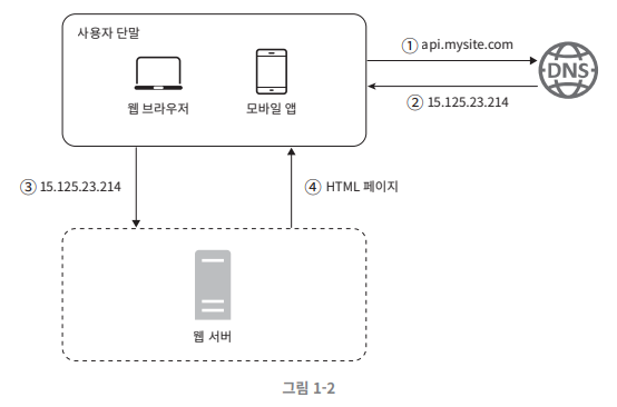 1. 사용자는 도메인 이름(api.mysite.com) 을 이용해 웹사이트에 접속한다. DNS(Domain Name Service)를 통해 도메인 이름은 IP 주소로 변환되는 요청이 우선적으로 일어난다. (이때 DNS는 제 3 사업자, third party가 제공하는 유료 서비스를 이용하므로, 우리 시스템의 일부가 아니다.)