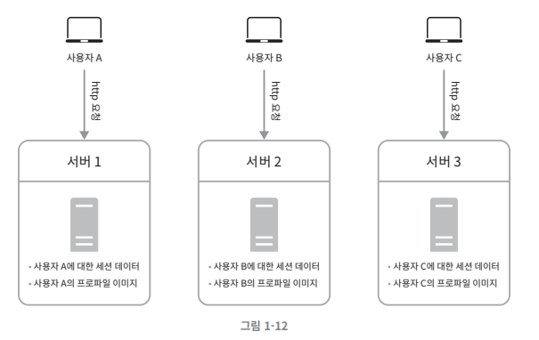 각 서버에서 서로 다른 클라이언트의 상태 정보를 보관하는 경우, 상태 정보 의존적인 아키텍처는 다음과 같이 표현할 수 있다. 사용자 A, B, C는 각각 서버 1,2,3가 각 세션 데이터와 사용자 상태 정보를 갖고 있으므로, http 요청을 각각의 서버에전송해야 인증 절차를 무사히 거칠 수 있게 된다.